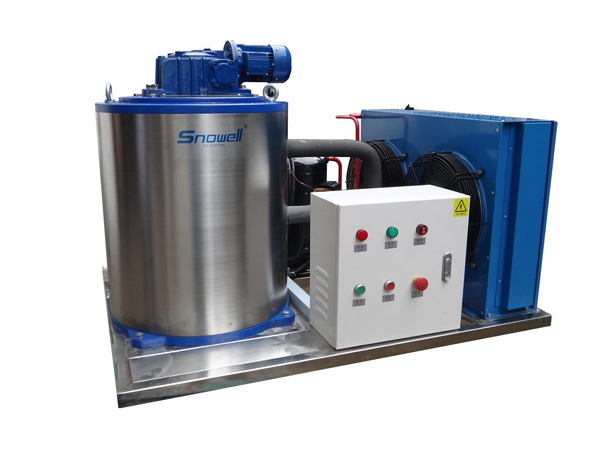 片冰機是制冰機的一種,按水源區(qū)分,可分為淡水片冰機,海水片冰機,一般多為工業(yè)制冰機。片冰為薄片、干爽疏松狀的白色冰,厚度1.0毫米到2.5毫米不等,片面形狀不規(guī)則,直徑約為12到45毫米。片冰無尖銳棱角,不會刺傷冷凍物體??蛇M入被冷卻物之間的間隙,減少熱交換,保持冰的溫度,并有良好的保濕效果。片冰制冷效果優(yōu)秀,有制冷量大、迅速的特點,因此主要應用于各種大型制冷設施、食品速凍、混凝土冷卻等等。